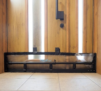 PVCの柔軟性と耐久性を活かし、水圧で変形しながら玄関からの浸水を防ぐ製品です。突っ張り棒の機構で簡単に設置でき、塩ビシートの密着により高い止水性能を発揮します。試験では、Ws-4(4~10L/H)と土嚢(Ws-1(50~200L/H))に比べて高い止水性能が確認されました。審査会では、線状降水帯など近年の降雨激甚化を踏まえた作品として評価されました。PVCシートに壁や床との密着性を高める特殊素材を複合し、高い止水効果を実現した点が高く評価されました。