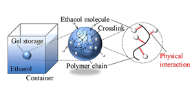 今回研究チームは、高分子ゲル中に液体燃料の保持を可能にしました。化学的に架橋されたポリ(N-イソプロピルアクリルアミド:PNIPAAm)ゲル内に一般的な液体燃料であるエタノールを保持した場合の性能、利点、限界について分析しました。