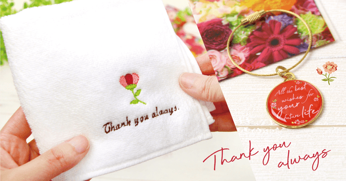 ほどよく厚みのある今治タオルハンカチに、かわいいお花と“Thank you always.(いつもありがとう)”の刺繍をあしらいました。色は、落ち着きのあるサーモンピンクと清潔感のあるホワイトからお選びいただけます。