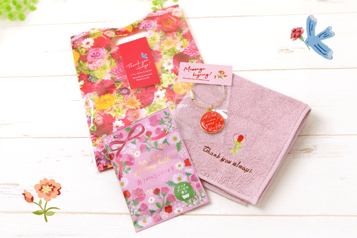 母の日らしいお花のビニールバッグ入りで、そのまま渡すことができます。“いつもありがとうございます”のシールで贈り主の気持ちが伝わります。