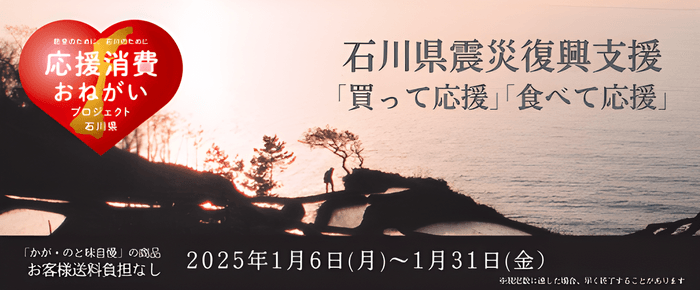 JA全農が運営する産地直送通販サイト「JAタウン」ショップ「かが・のと味自慢」では、令和7年1月6日(月)から1月31日(金)までの間、石川県震災復興支援「買って応援」「食べて応援」企画を実施します。