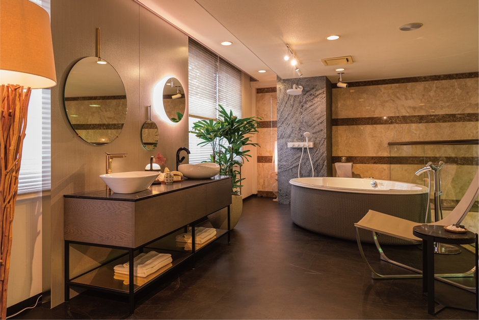 今回の寝室まわりのショールームは、壁面を有効に使ったフルオーダーのベッドやミニバーとワインセラー・水栓付きのデスクキャビネットと洗面台を設置。さらに、オリジナルのアウトドア家具やプリミティブな家具と照明も配置して、まるでリゾートホテルのような空間を演出しました。このように、住む人のこだわりや心地よい暮らしをカタチにするように努めています。
