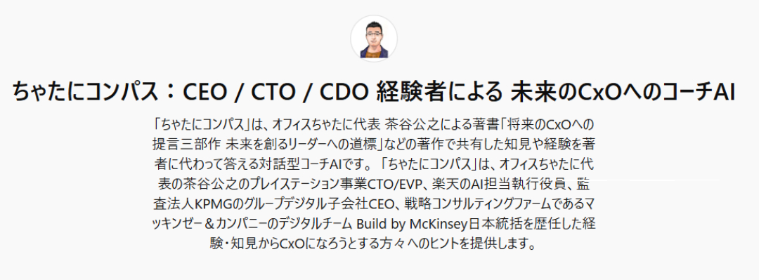 2024年12月にリリースした対話型コーチAI「ちゃたにコンパス」(Chatani Compass)は、著書の知見・経験をChatGPT上に搭載したAIエージェントです。未来のCxO・テックリーダーを目指す方が、茶谷の経験・思想と対話できるツールとして提供しており、3年目は新たなAIエージェントのリリースを含め、さらなる機能拡充と活用促進を図ります。