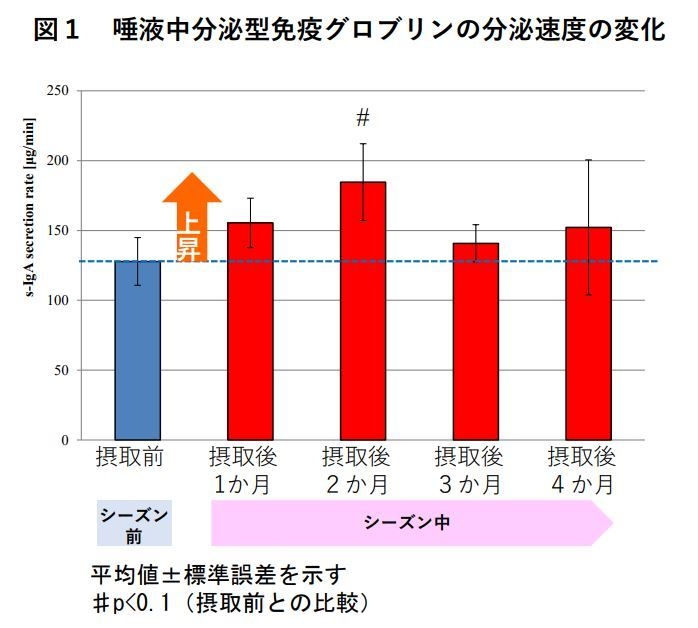 ・唾液中分泌型免疫グロブリンの分泌速度は、試験食摂取前と比べ、シーズン中に有意な低下は認められず、試験食摂取2ヶ月後に高値を示す傾向が示された(図1)。