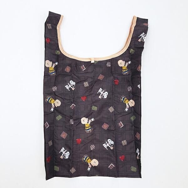 裏側はチャーリーとスヌーピー、それに美味しそうなボンボンショコラを散りばめた総柄デザイン。チョコレート好きにはたまらない、スイートなエコバッグです。