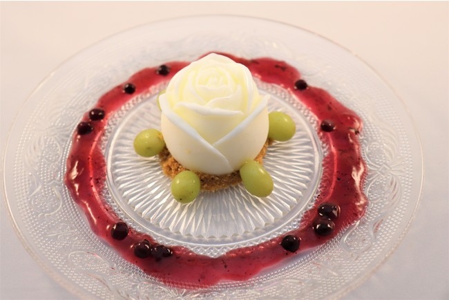 【味】真ん中に白薔薇の形をしたケーキ(レアチーズ風味)/白ブドウ/ブルーベリーソース