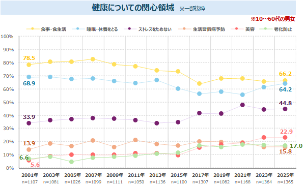 健康について関心がある領域では、依然として「食事・食生活」が高いものの、約10年前と比べると関心はやや低下傾向にある。一方で、「ストレスケア」「美容」「老化防止」といった領域への関心はゆるやかに拡大している。