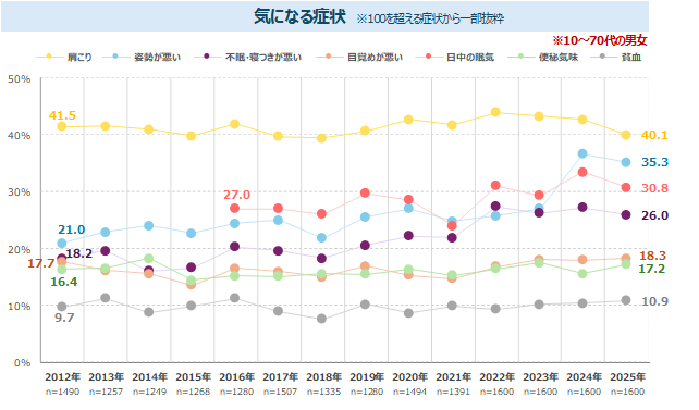 また、「日中の眠気」「不眠・寝つきが悪い」といった睡眠関連の悩みについても、昨年と概ね同程度で推移しており、生活者にとって日常的な健康課題となっていることがうかがえる。