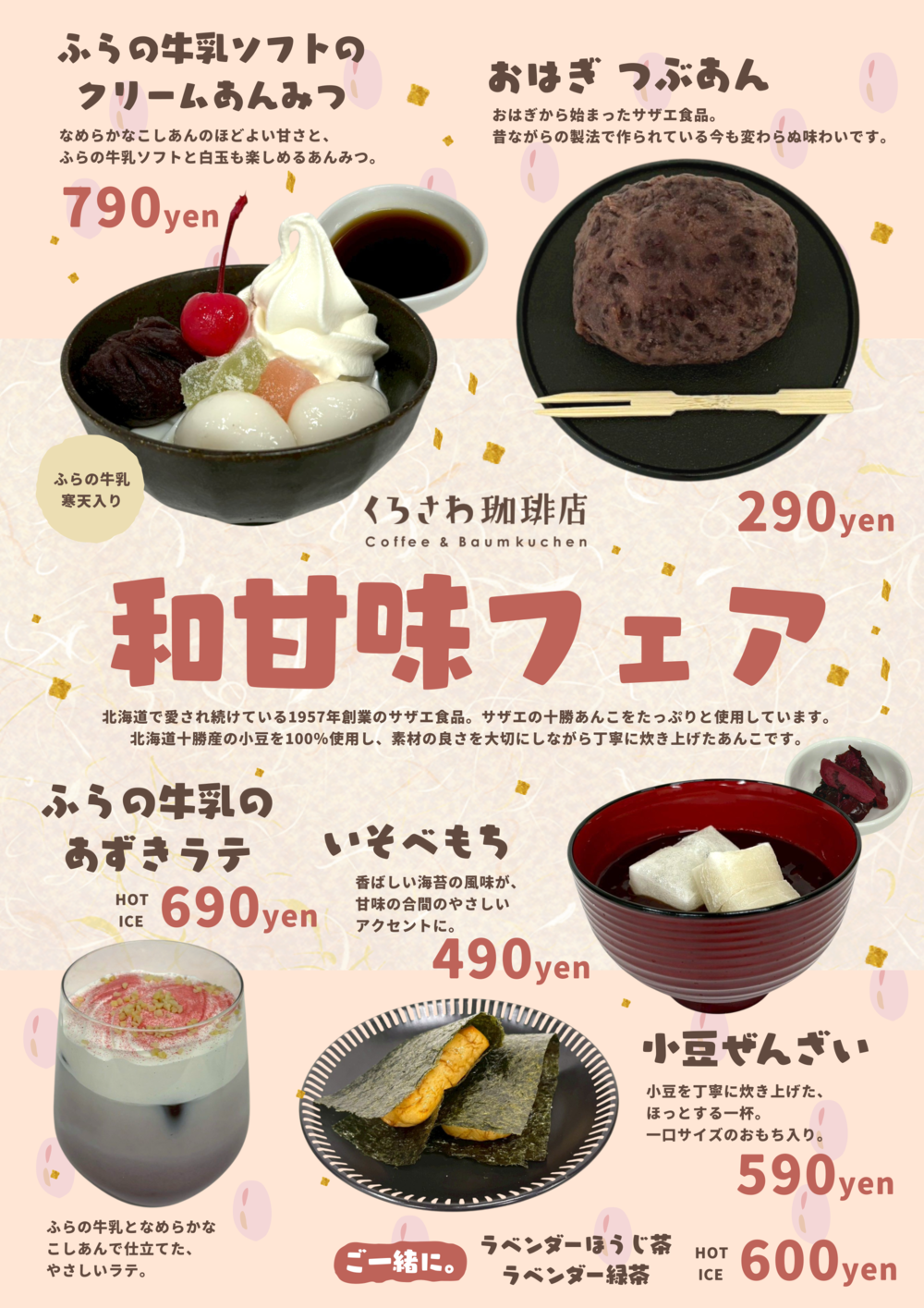 1957年創業の北海道で愛され続けているサザエ食品のあんこを使用した和甘味フェアをスタートいたします。