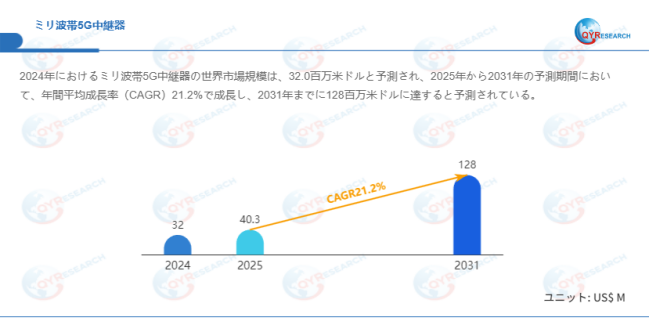 QYResearchが発表した新たな市場調査レポート「ミリ波帯5G中継器―グローバル市場シェアとランキング、全体の売上と需要予測、2026~2032」によると、世界のミリ波帯5G中継器市場規模は2024年の約32百万米ドルから2025年の40.3百万米ドルへと順調に拡大すると見込まれ、予測期間中は年平均成長率(CAGR)21.2%で成長し、2031年には128百万米ドルに達すると予測されている。