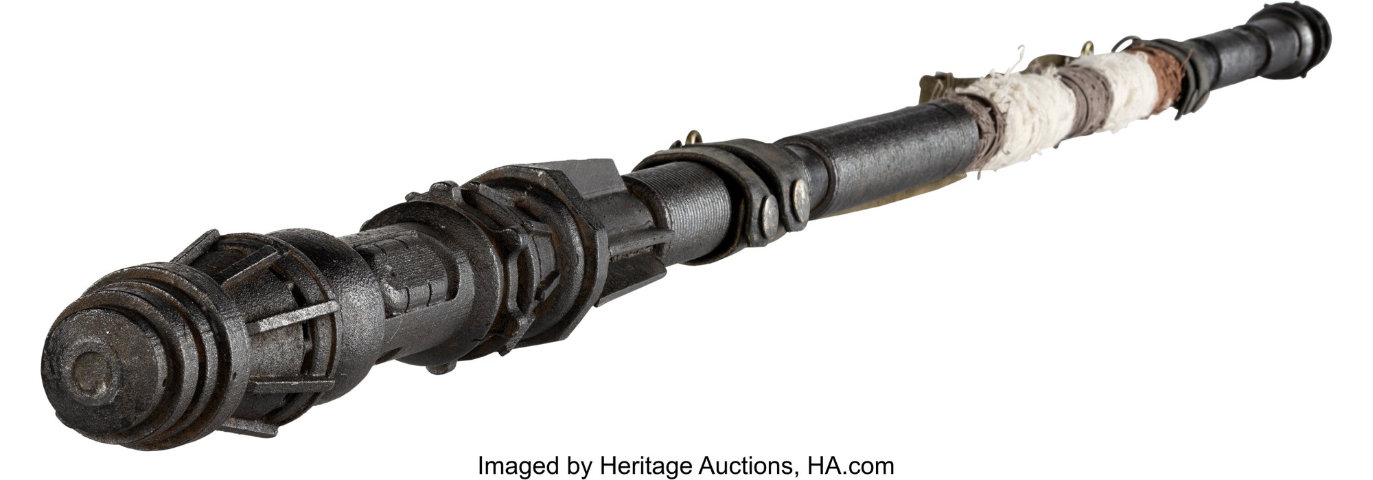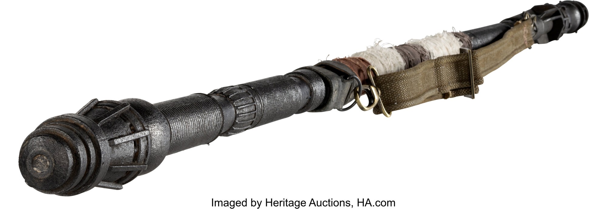 続三部作の主要キャラクターの一人を象徴とする本品は、撮影現場での使用による軽微な擦れや、布製ハンドル部分への経年劣化を表現した加工など、映画の制作過程を物語る痕跡が節々に見られます。