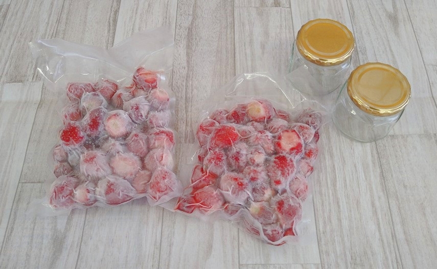 美作農園の新鮮朝採りいちごをその日のうちに急速冷凍し、真空包装した冷凍いちご500gの袋が2つと、大容量のジャム用ビン2つ、美作農園のジャムが再現できるレシピがセットになった商品で、砂糖とレモンを準備するだけで簡単にジャム作りを楽しんでいただけます。この春、ご家族やご友人とおうち時間を楽しめるセットとなっています。