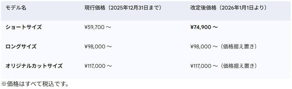 2026年1月1日以降、ショートサイズモデルの価格を改定いたします。