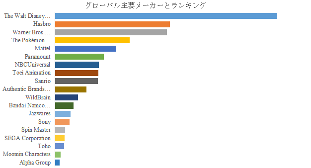 LP Informationのトップ企業研究センターによると、ライセンスキャラクター商品の世界的な主要製造業者には、The Walt Disney Company、Hasbro、Warner Bros. Discovery、The Pokémon Company、Mattel、Paramount、NBCUniversal、Toei Animation、Sanrio、Authentic Brands Groupなどが含まれている。2024年、世界のトップ5企業は売上の観点から約48.0%の市場シェアを持っていた。