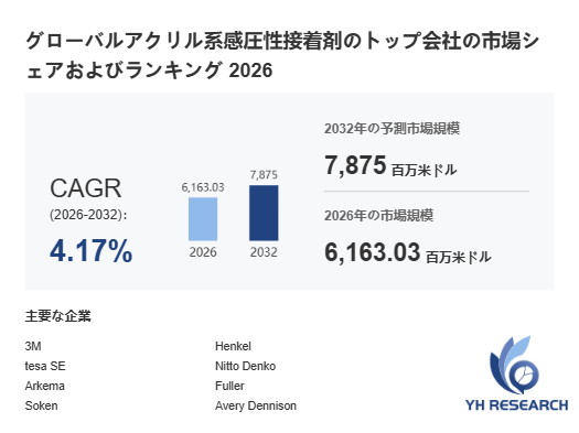 上記の図表/データは、YHResearchの最新レポート「グローバルアクリル系感圧性接着剤のトップ会社の市場シェアおよびランキング 2026」から引用されています。