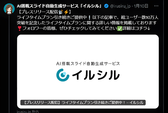 「イルシル」の X 公式アカウント(@irusiru_jp)では、「イルシル」が提供するサービスに関する最新情報のほか、資料作成に役立つ便利なTipsやAI情報を定期的に発信しています!日頃「イルシル」のサービスを利用してくださっている方や、興味を持ってくださっている皆様の日々の業務や作業効率化に貢献する内容を目指しています。