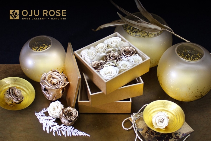 ローズギャラリー、箔一ともに1975年創業。ローズギャラリーは創業50周年を迎え、「伝統と革新」をテーマに更なる進化を目指しております。箔一とのコラボレーションは薔薇という植物と、箔一の伝統の美のコラボレーションマリアージュです。今回の商品「OJU ROSE」に込められたストーリーにプラスワン、お客様によりそれぞれ異なるシーンでご利用いただく、パーソナルストーリーをお重に加えていただく唯一無二の「OJU ROSE」。