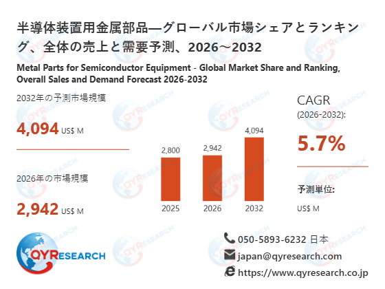 QYResearch調査チームの最新レポート「半導体装置用金属部品―グローバル市場シェアとランキング、全体の売上と需要予測、2026~2032」によると、半導体装置用金属部品の世界市場は、2025年に2800百万米ドルと推定され、2026年には2942百万米ドルに達すると予測されています。その後、2026年から2032年にかけて年平均成長率(CAGR)5.7%で推移し、2032年には4094百万米ドルに拡大すると見込まれています。
