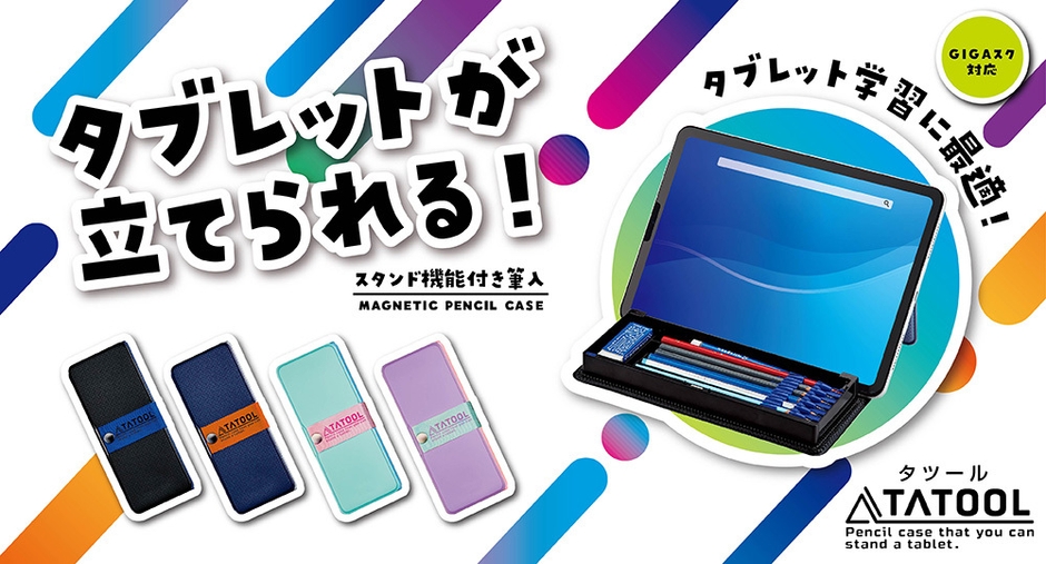タブレットが立てられるスタンド機能付き筆入 「タツール筆入」が新登場!