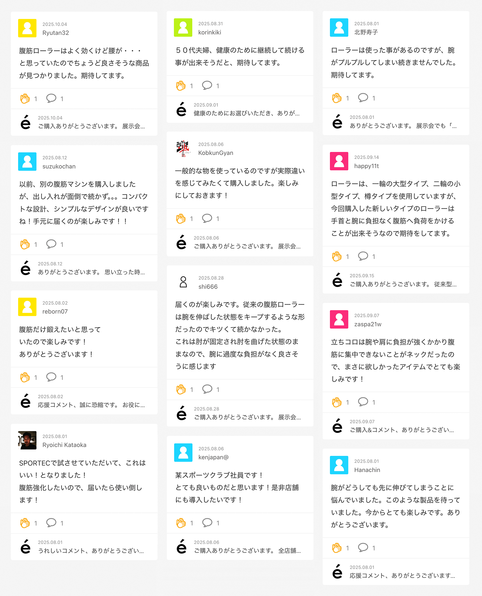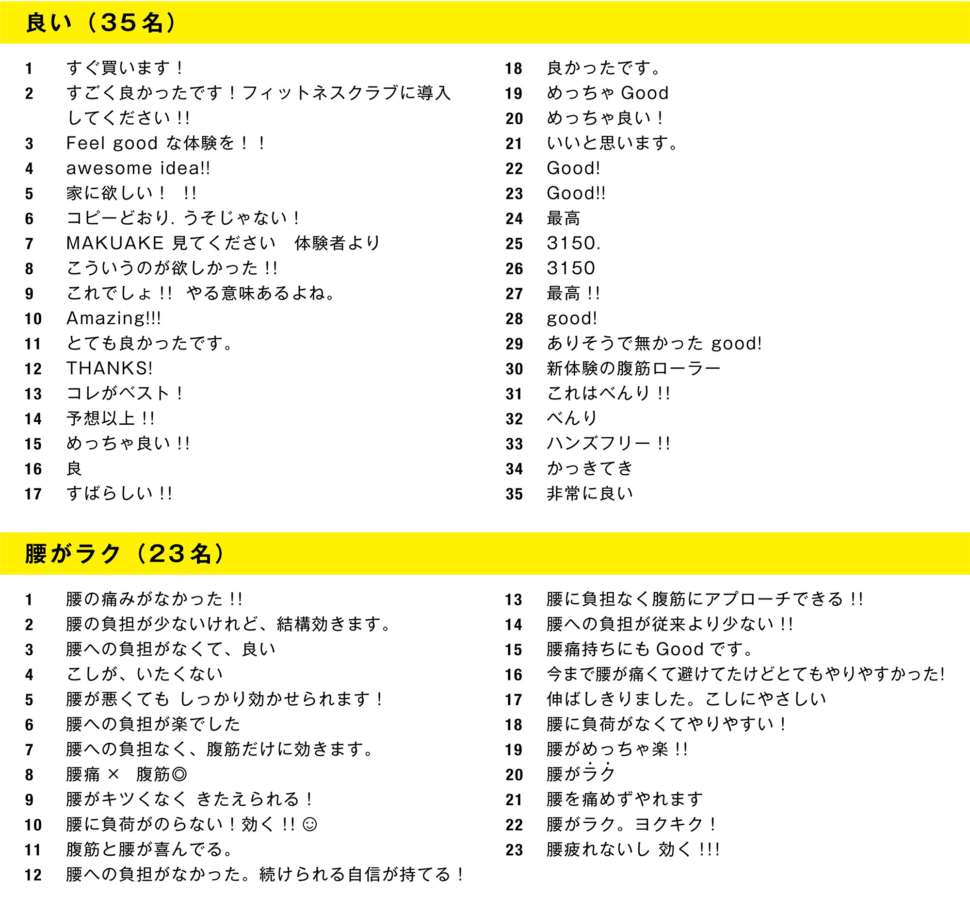 腕や腰への負担を軽減し、腹筋に効果を集中させる独自構造が評価され、多くの応援コメントが寄せられている。