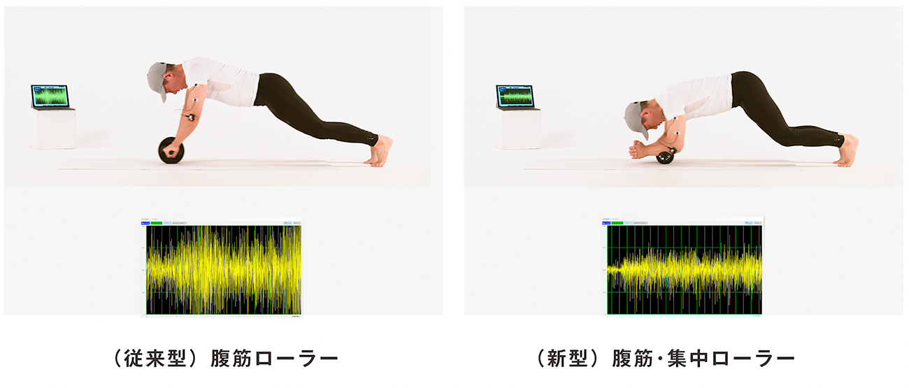 「腹筋・集中ローラー」は、従来型に比べて、上腕三頭筋(腕の裏側)への負担が軽減されています。その分、腹筋に集中しやすくなり、動きにもムダがありません。