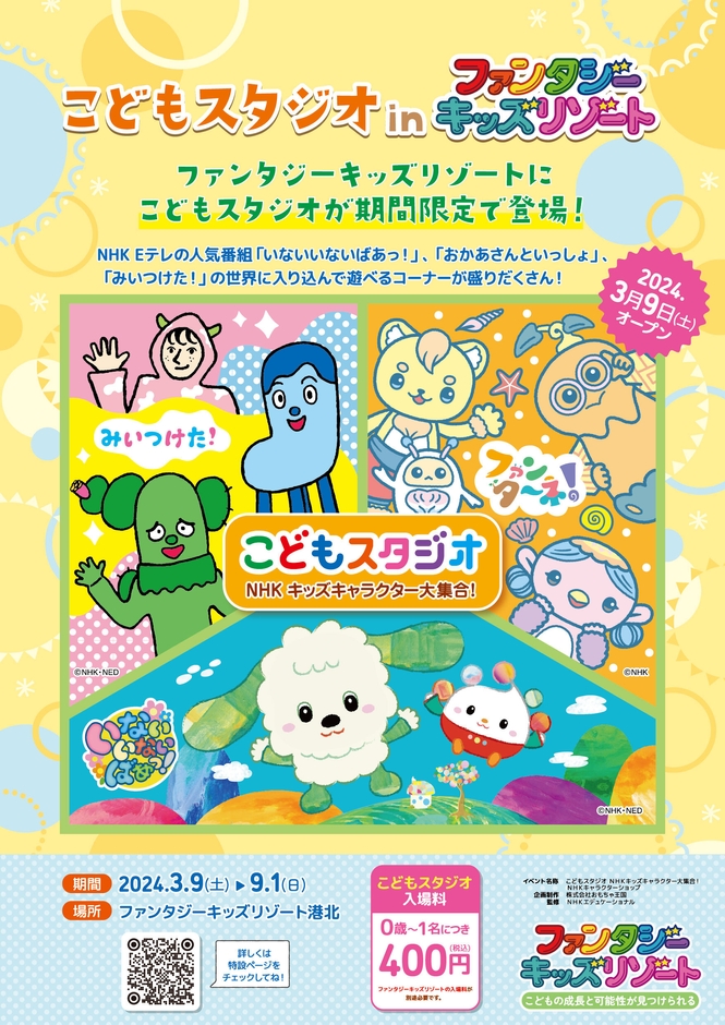 日本最大級の室内遊園地「ファンタジーキッズリゾート」(運営:ファンタジーリゾート株式会社、代表取締役社長:八杉 政彦)は、期間限定の特別企画として、人気のNHKキッズキャラクターが大集合する「こどもスタジオ」を、2024年3月9日(土)~2024年9月1日(日)、ファンタジーキッズリゾート港北店内の特設エリアにて開催します。