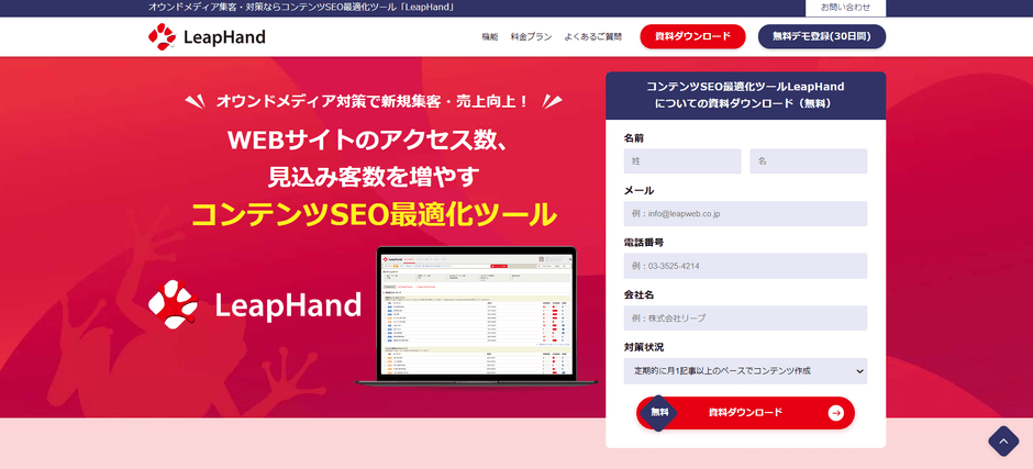 SEO対策やMEO対策をはじめ、WEBマーケティング全般をサポートする株式会社リープが、2022年11月16日(水)よりコンテンツSEO最適化ツール「LeapHand(リープハンド)」にて、無料デモ利用プランを新たに開設します。