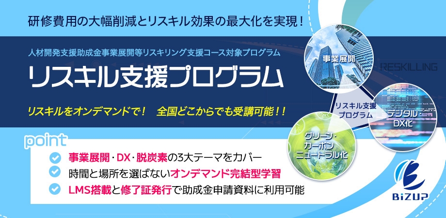 株式会社ビズアップ総研(本社:東京都港区、代表取締役:吉岡 高広、以下 当社)は2023年4月3日に、人材開発支援助成金「事業展開等リスキリング支援コース」を対象としたeラーニングプログラム「リスキル支援プログラム」をリリースしました。