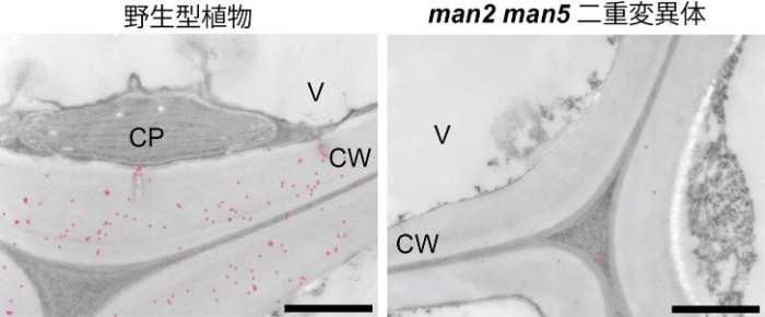 非典型タイプのマンナナーゼであるMAN2とMAN5の両方を欠損したシロイヌナズナ※4 のman2 man5二重変異体の茎から横断切片を作成し、特異的な抗体を用いてグルコマンナンを染色したところ、二重変異体では細胞壁のグルコマンナンがほとんど失われていることがわかりました。また、細胞壁の成分を可溶性画分、アルカリで抽出される画分(アルカリ画分)、残渣の不溶性画分に分画し、それぞれの構成糖を調べたところ、いずれの画分においてもグルコマンナンに由来するマンノース※5 の量が著しく減少していることが確認されました(図3)。さらに、免疫電子顕微鏡観察を行ったところ、抗体で染色して観察した場合と同様に、man2 man5二重変異体では細胞壁中のグルコマンナンがほとんど失われていることが確認されました(図4)。