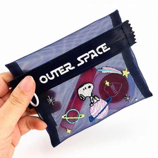メッシュ素材がこれからの時期にもピッタリなポーチは、用途もいろいろ♪宇宙をモチーフとしていて、淡いカラーの刺繍がとってもかわいいんです。