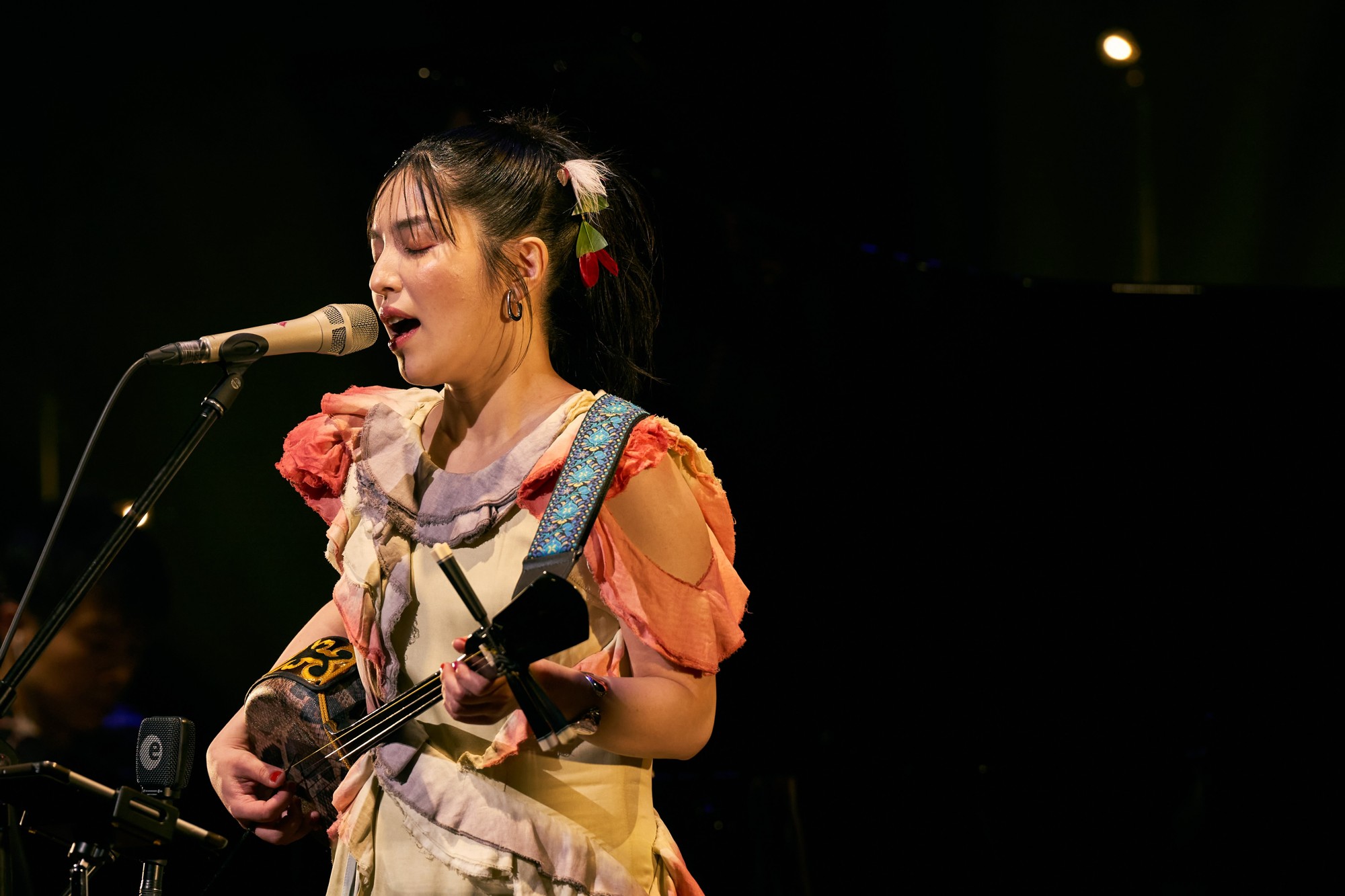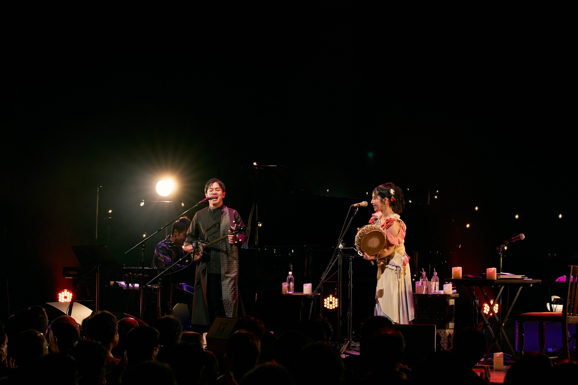 この日、大手町三井ホールで開催された東京公演にはゲストの前山真吾が『きょら島〜うつくしい島〜』『豊年節』『ワイド節』『ヨイスラ』に参加。