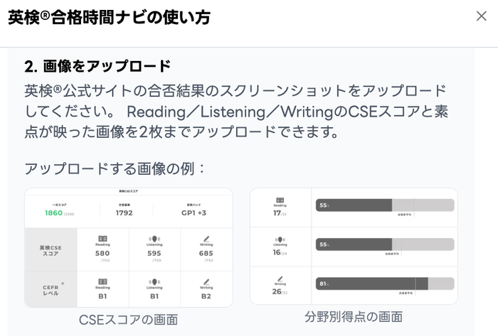 ユーザーは英検(R)公式サイトの合否ページをスクリーンショットし、Reading・Listening・WritingのCSEスコアや素点(正答数)がしっかり映った2枚程度をスタスタAppsにアップロードします。独自の画像解析技術で、それらを自動的に読み取り、合格基準との差分を計算します。
