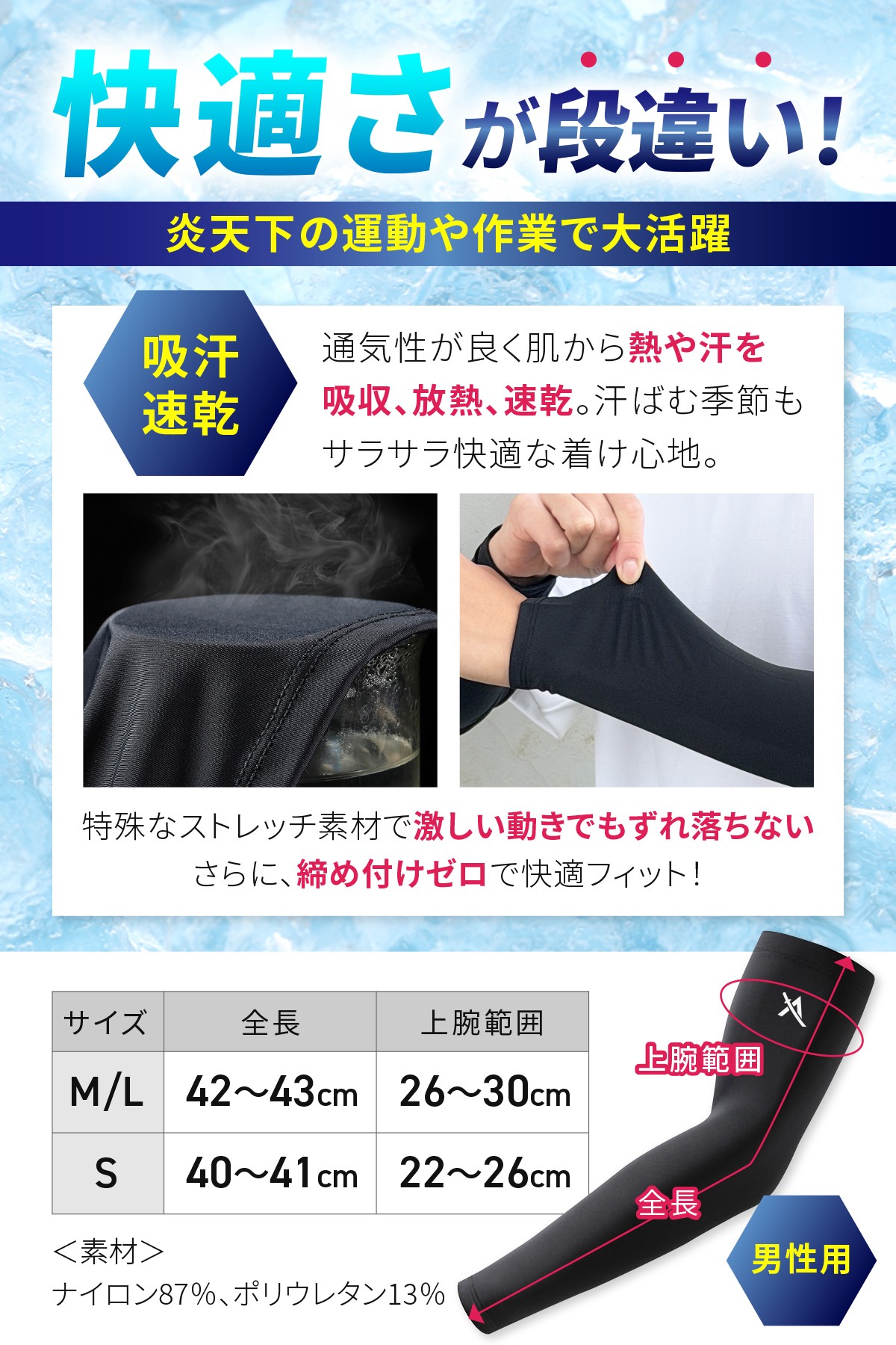 装着した瞬間、肌にひんやりとした心地よさが広がります。気化熱を利用した吸汗速乾機能により、汗をかいてもサラサラの状態を持続させます。
