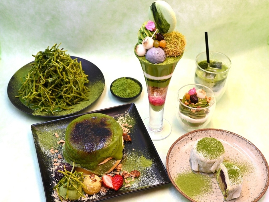 さらに、季節限定「桜香るお抹茶づくしパフェ」は、濃厚生クリームや、ひんやりアイスクリーム、もちっと食感の葛餅など様々な角度からお抹茶を堪能できます。華やかなピンクの桜ソースやゼリーがアクセント。お食事後のデザートにピッタリの抹茶アイスラテや抹茶ミニパフェもご用意しております。