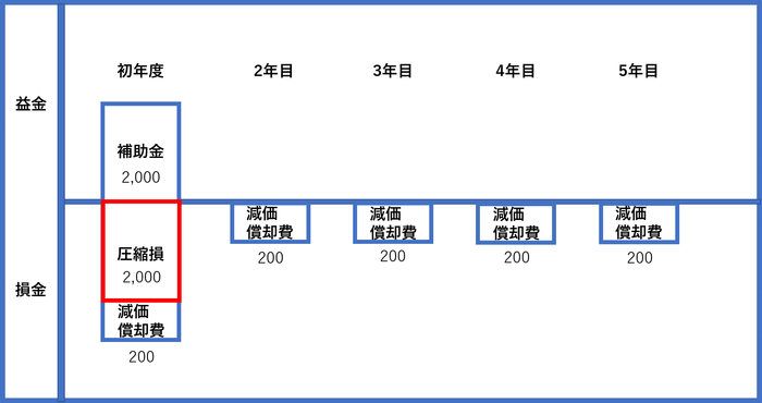 図3は圧縮記帳を適用した場合で、初年度に補助金2,000万円を益金の額に計上しているのは図2と同様ですが、損金の額には圧縮損2,000万円(補助金の額と一致)と、設備等の額から圧縮損を引いた残額である1,000万円を5年で償却した200万円を計上しています。このような処理により、補助金の額と圧縮損が相殺されて補助金に対する課税額はゼロとなります。一方、設備等の取得価額が、補助金と同額が減額されて1,000万円になっているため、図2と比べて減価償却費の額も600万円から200万円へ減額されています。