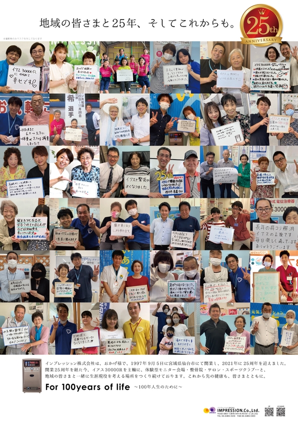 インプレッション株式会社(本社:兵庫県尼崎市、代表取締役:小島 雄一)は令和3年9月5日をもって創立25周年を迎えます。創立25周年を経た今、IAS3000Rを主軸に、健康サロン【いあスパ】整骨院・スポーツクラブと地域の皆様と一緒に生涯現役を考える場所を作り続けております。創立25周年を記念して令和3年9月1日より特別感謝キャンペーンを健康サロン『いあスパ』で開催しております。