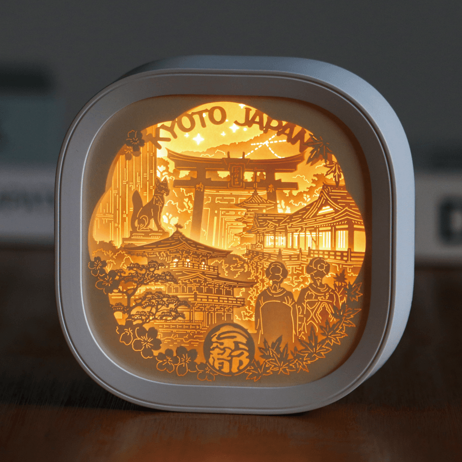 『Nippon Collections(ニッポンこれくしょん)』は、4~10枚の特殊高級紙に精緻なレーザーカットを施し、立体的で奥行きのある風景を再現。柔らかなLEDの光が層の間から灯り、まるでジオラマのように旅の情景を浮かび上がらせるペーパーライトです。