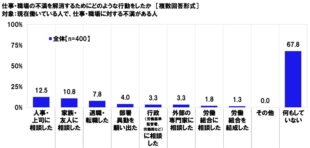現在働いている人で、仕事・職場に対する不満がある人(400名)に、仕事・職場の不満を解消するためにどのような行動をしたか聞いたところ、「人事・上司に相談した」は12.5%、「家族・友人に相談した」は10.8%、「退職・転職した」は7.8%、「部署異動を願い出た」は4.0%、「行政(労働基準監督署、労働局など)に相談した」と「外部の専門家に相談した」は3.3%、「労働組合に相談した」は1.8%と、いずれも低い割合にとどまりました。他方、「何もしていない」は67.8%となり、不満を感じている人の大多数は特に行動せず不満を抱えたままのようです。
