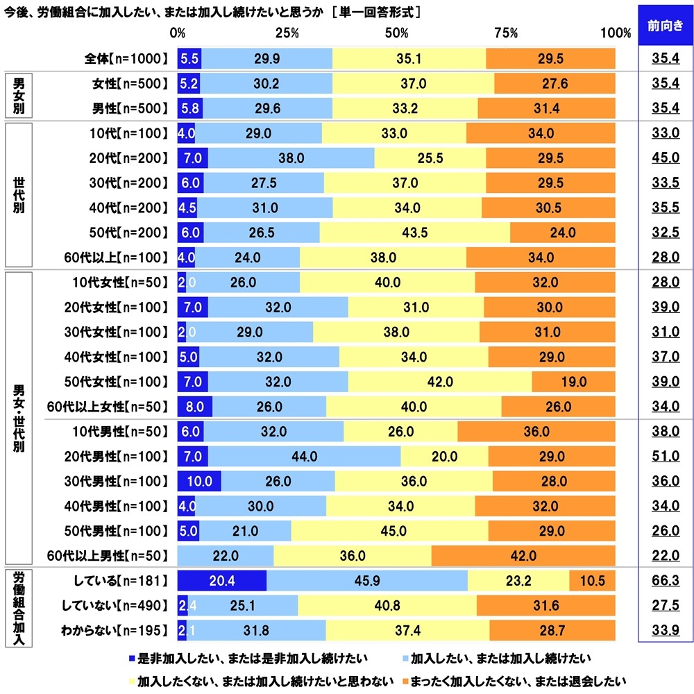 ◆「今後、労働組合に加入したい・加入し続けたい」35.4%、20代男性では51.0%