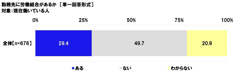 現在働いている人(676名)に、勤務先に労働組合があるか聞いたところ、「ある」は29.4%、「ない」は49.7%、「わからない」は20.9%となりました。