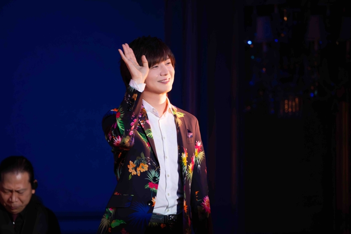 バンドの演奏が始まると、ボタニカル柄が特徴的なネイビーのジャケットに身を包んだ竹島が登場。オープニングに『生きて愛して』『シャツの釦』『時間よ止まれ』を3曲続けて披露し、ライブが幕開。