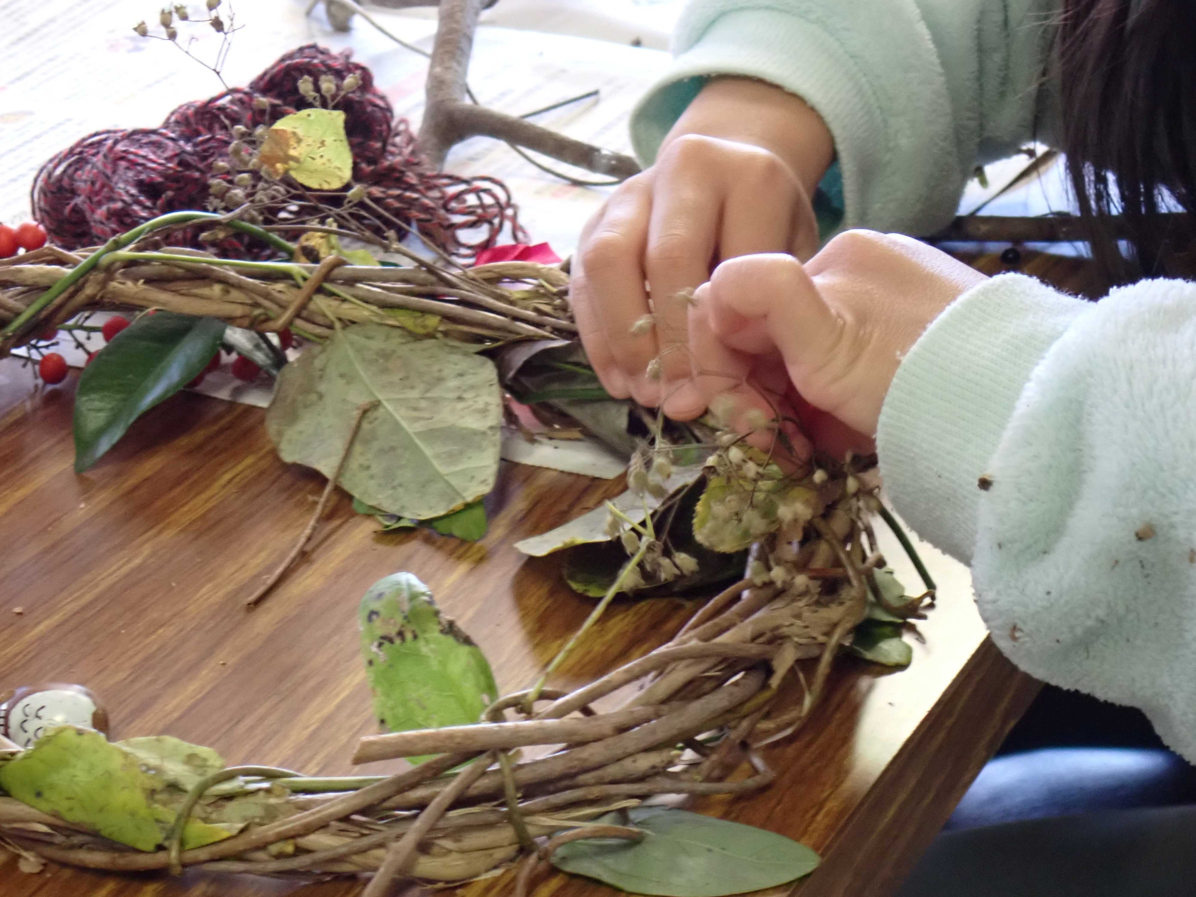 ガイドウォーク、リースの材料集め。集めた材料を使ってのリースづくり。