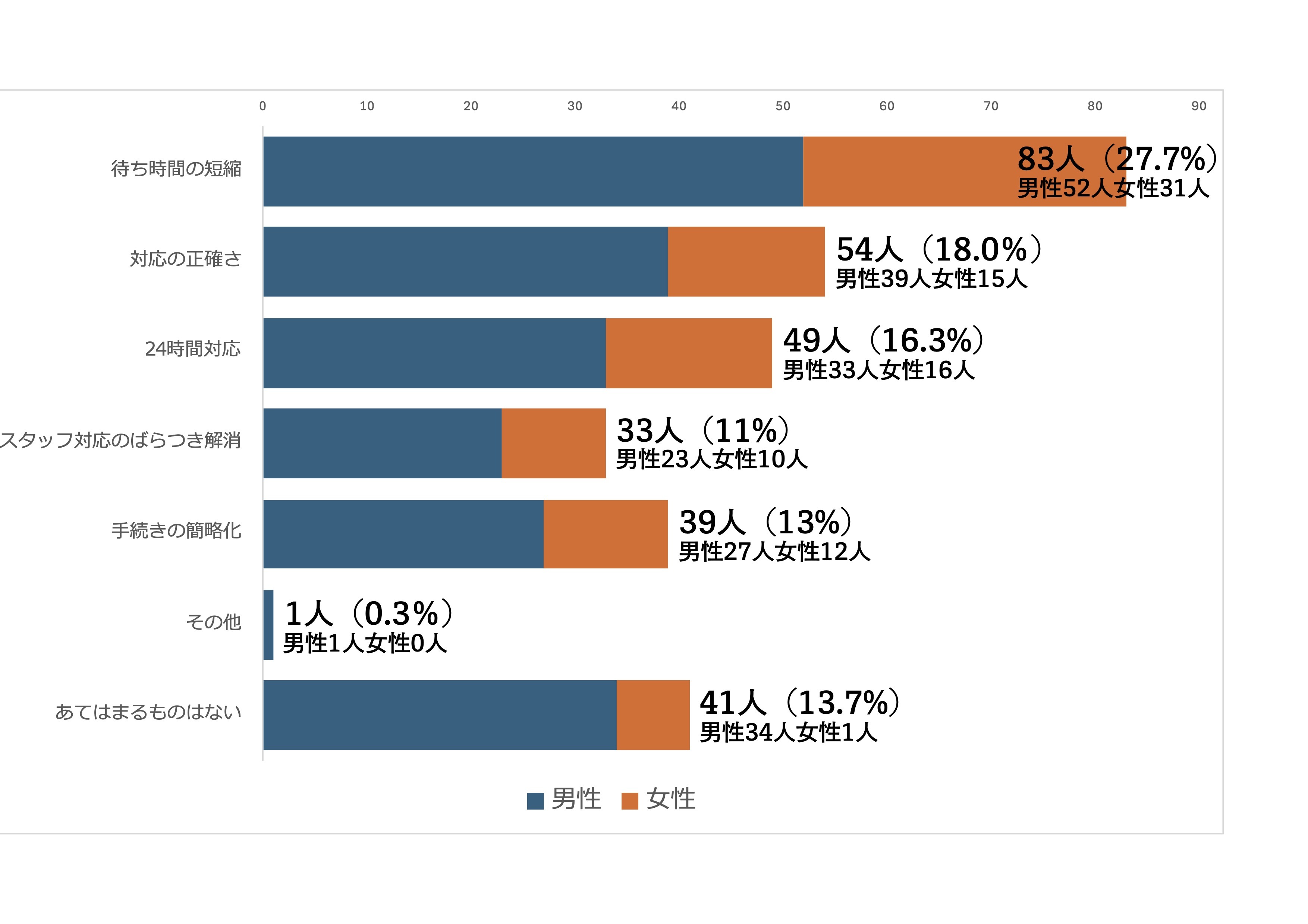 「待ち時間の短縮」が28%で、「対応の正確さ」が18%、「24時間対応」は16%と続く。「当てはまるものはない」も14%ある。