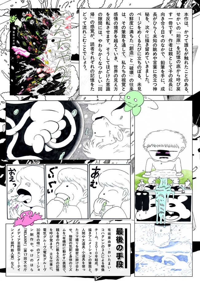 手描きアニメーションの筆致と、人間や大道具・小道具を使ったコマ撮りを緻密に掛け合わせ、物質の気配と身体のリズムを「有機的に動かす」表現で、観る者の内に眠る太古の記憶を呼び覚ます。