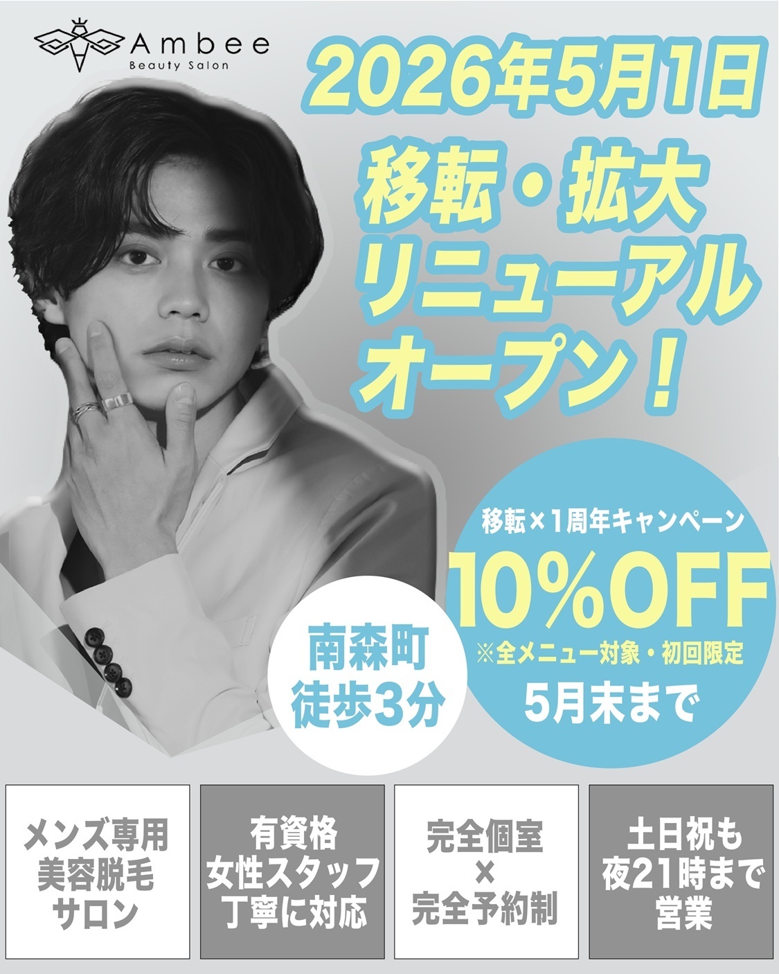 株式会社Twice Up (所在地:大阪市中央区)は メンズ専用美容サロン「Ambee(アンビー)」がオープンから1周年を迎えるにあたり、2026年5月1日(金)大阪市北区天神橋への移転・拡大リニューアルオープンを実施いたします。