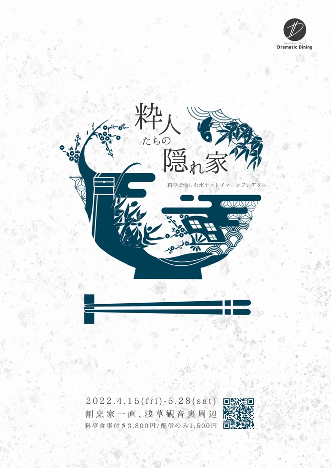 アートの視点で世界を捉え直す没入体験を提供するイマーシブシアターのクリエイティブチーム「Dramatic Dining」(代表:竹島唯、近藤香)は、2022年4月15日(金)~5月28日(土)の期間中一部日程で、浅草の老舗料亭「割烹家 一直」と浅草観音裏周辺にて、『料亭で愉しむポケットイマーシブシアター -粋人たちの隠れ家-』を開催します。