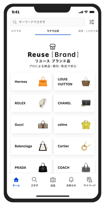 「ラクマ公式ショップ」では、出品ページに「公式マーク」が表示され、個人の出品者と事業者を見分けることができ、従来の個人間取引と同様に、楽天会員であればどなたでもご利用いただけます。