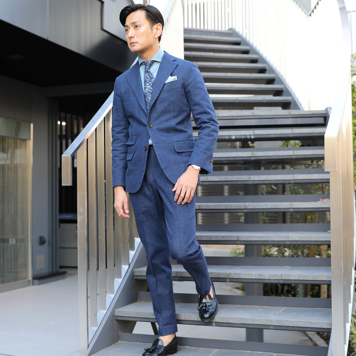 ビシッと決まったシンプルなスーツも素敵ですが、デニムスーツで周りに差を付けるのもおすすめです。