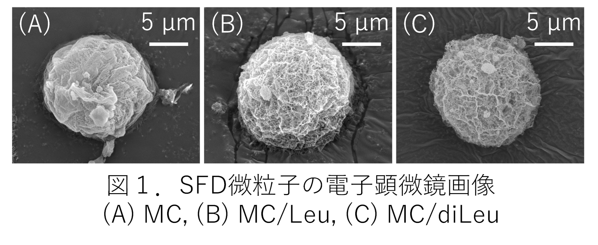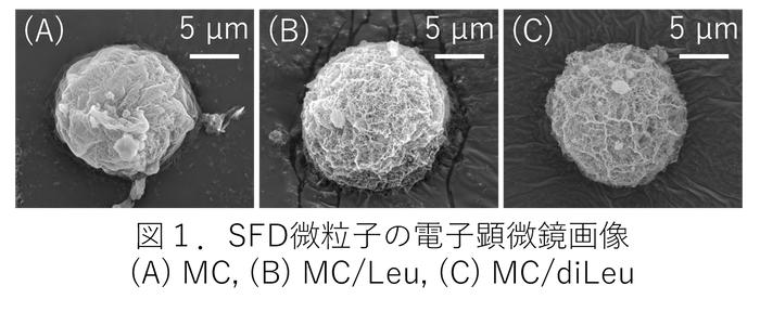 作成したSFD微粒子を電子顕微鏡で観察したところ、成分による大きな違いはみられず、すべてのSFD微粒子が10–20 µmの直径で中空多孔性に富む球状構造を有していました (図1)。