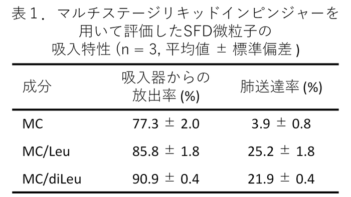 次にSFD微粒子の物性を評価したところ、MC単独から成るSFD微粒子では、粒子同士の凝集により気中で分散し難く、また吸湿しやすい点からも、吸入剤としての適用が困難でした。一方、LeuまたはdiLeuと組み合わせることで、SFD微粒子の気中分散性と耐吸湿性が改善され、肺送達率が約4%から20–25%まで顕著に増大し、実用化された吸入剤と同程度の肺送達率に達しました (表1)。